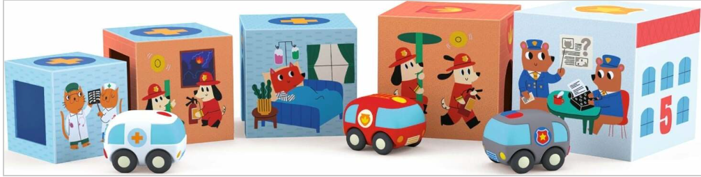 5 illustrated blocks housing 3 vehicles to play with and build a lovely town. Lots of ways to play: children can stack the blocks to create a tower or fit them together.