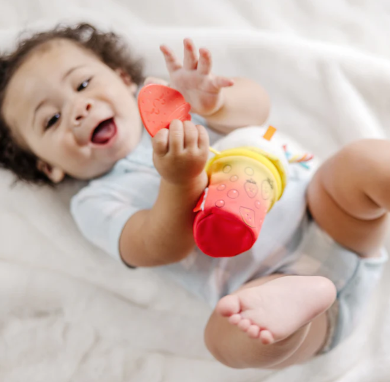 Break out this bubble tea clip-on toy to entertain babies while stimulating their senses—without the caffeine! The ombre fabric-covered soft cup is easy for small hands to grasp and jingles when shaken. Open the attached squishy “whipped cream” top with ribbons to reveal a peek-a-boo mirror underneath to surprise and delight. Firm plastic pineapple and strawberry pieces are textured to temp tiny fingers to touch! Bring the fun wherever baby goes—easily clip the five-piece, multi-textured toy onto a stroller, car seat, diaper bag, or high chair to keep it close at hand. Melissa & Doug infant and toddler toys inspire “a-ha!” moments of discovery. Adorable, diverse characters and a variety of fun shapes and textures encourage exploratory, skill-building play.
