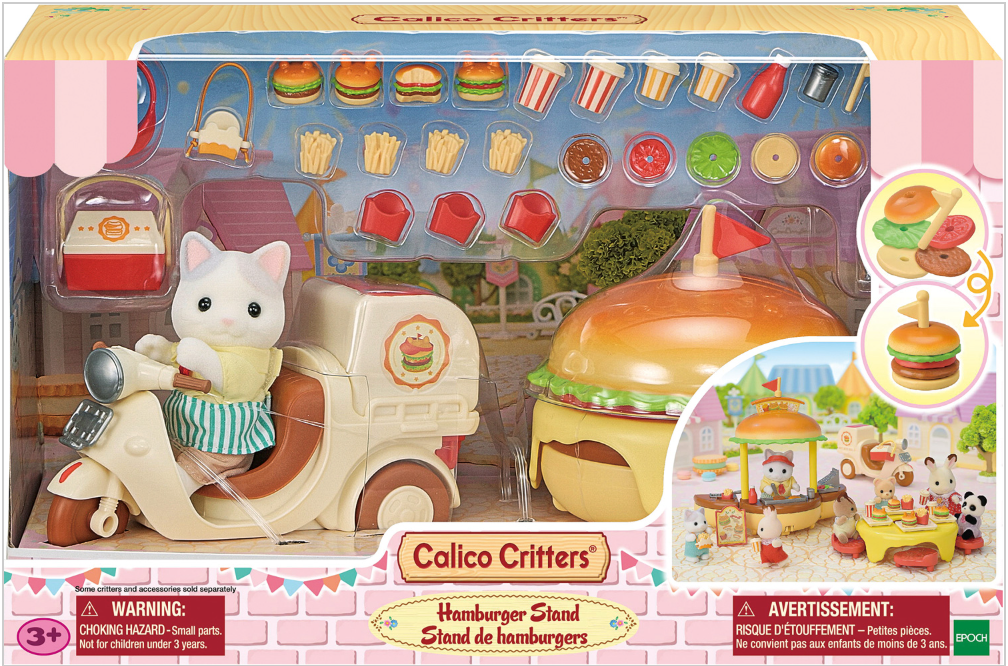 Mmm, smells like burgers! Looks like Latte Cat Father Mateo has rolled up in his hamburger stand, dressed in his chef's outfit, and is ready to grill up a feast. Hours of pretend play await with all the included accessories: cash register, menu, food trays, burgers, fries, and drinks, scooter, condiments, and more. We love that part of the burger stand becomes a "cheese" table with 3 "tomato" chairs, and that everything stacks back together when Mateo is ready to hit the road.