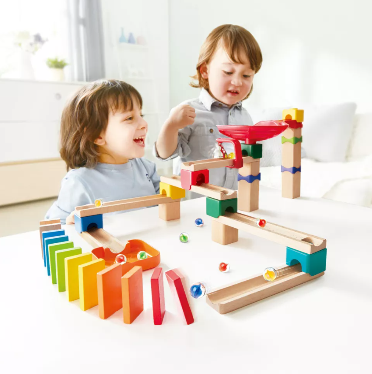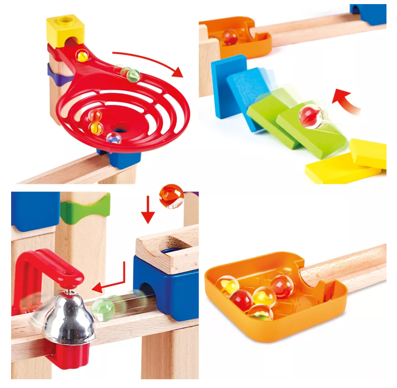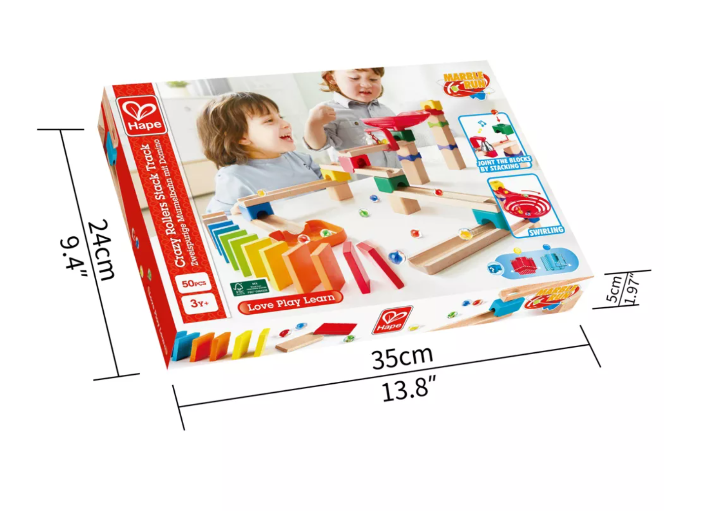 On your marks, get set, ROLL some marbles with this great Do-It-Yourself block set! Build the towers and tracks then send your marbles rolling down through all the tricks, twists and surprises! Will it land in the tray or KO all the dominoes? This do-it-yourself marble block set features all the thrills of marble speed racing with its unique configurations. Includes blocks, tracks, marbles, and everything needed to create this fun track. This exhilarating 50-piece wooden racetrack for kids three years and up with no fixed assembly required, allows for countless configurations. Join with any other Hape marble set to make fantastic longer tracks! Ready...Set...and Roll! Watch your marbles go racing down a compelling host of surprising tricks and twists, this fantastic playset includes a ring bell, a spiral funnel, a marble tray, and 12 dominoes for your marbles to pass through!