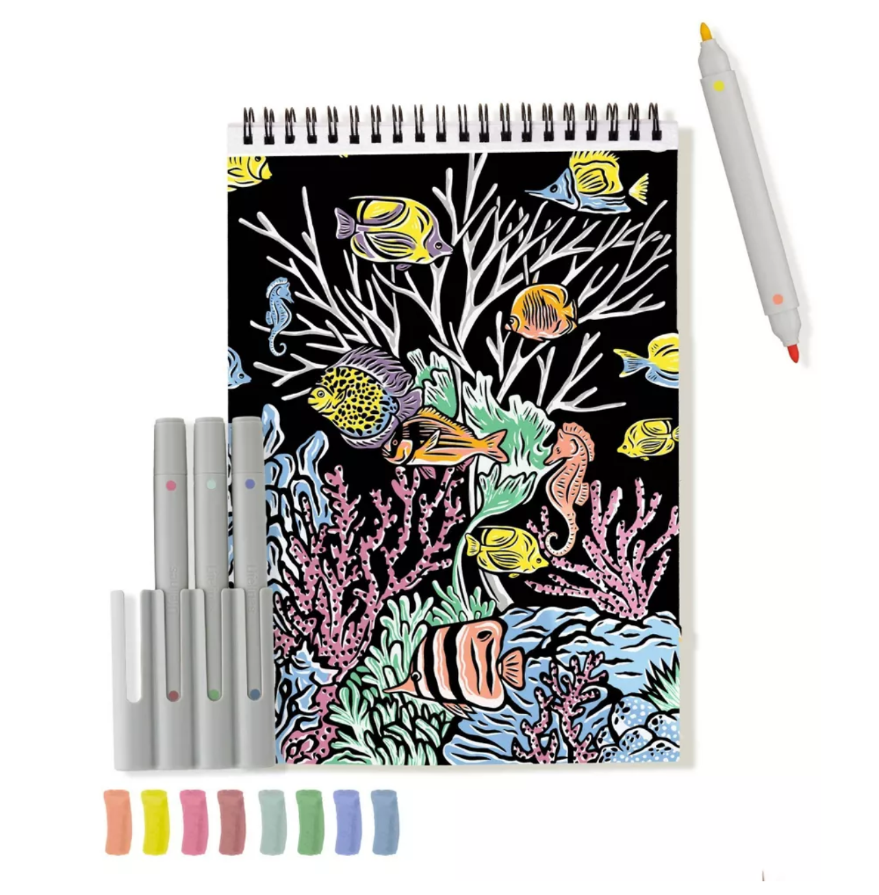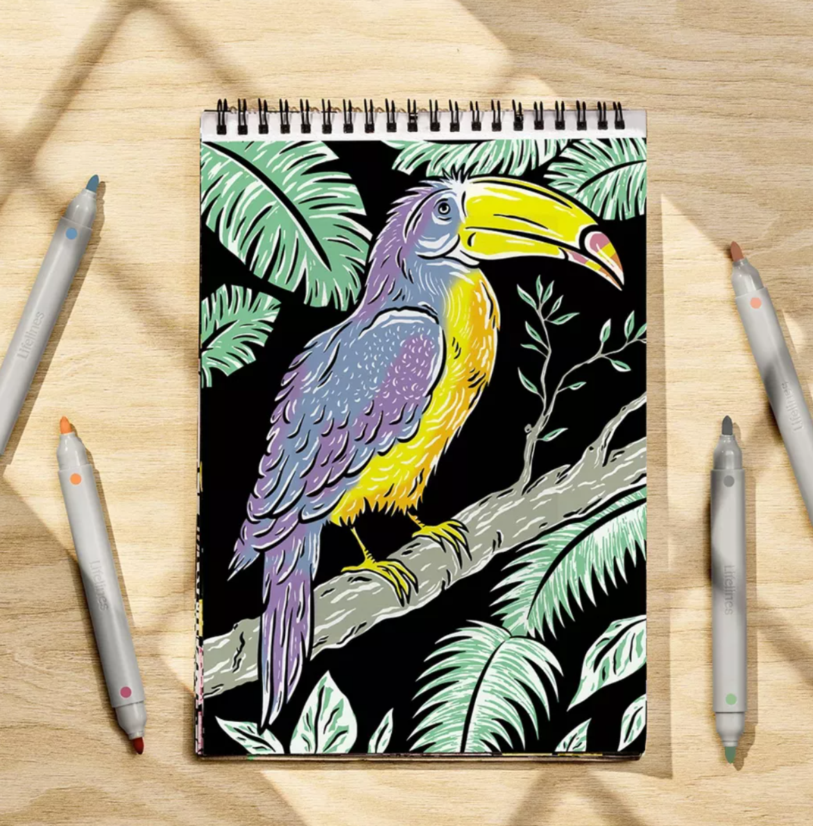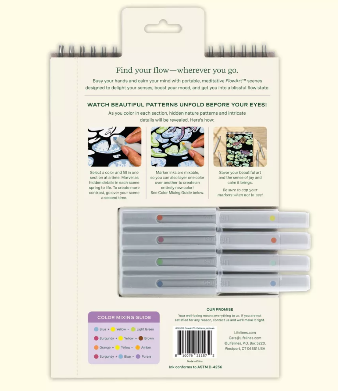 Lifelines FlowArt Pads are guided art meditations designed to help you achieve a calming flow state. Each scene is thoughtfully crafted to encourage repetitive, relaxing movements, promoting mindfulness and reducing stress. Hidden Patterns includes 20 meditative scenes and four double-sided markers in a detachable storage tray. As you color in each section, hidden nature patterns and intricate details will be revealed, adding captivating detail to the scene. Marker inks are mixable, so you can layer one color over another to create an entirely new color. Compact and portable, this pad is perfect for calming your mind on-the-go, unwinding before bed, or taking a work or study break to de-stress.
