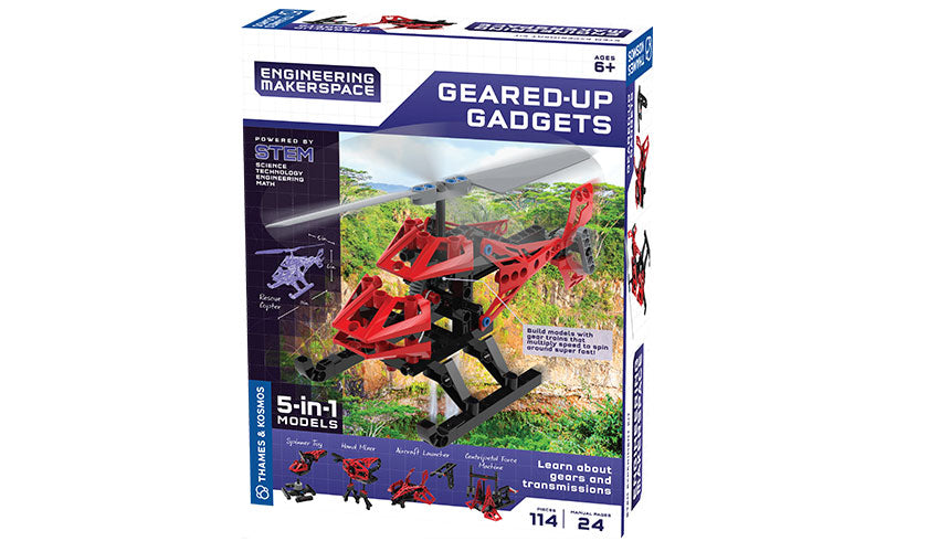 Build five fun gadgets and learn about gears and transmissions. Create a helicopter model with a rotor that spins using a rubber band-powered motor. Assemble a spinner toy that you wind up to launch a fast-spinning top. Make a centripetal force machine that flings its arms outward at high speeds. Build a hand-mixer that demonstrates a gear train. Construct a cool aircraft launcher that flings a model vehicle across the room on a zipline. A 24-page manual guides your model building and experiments with step-by-step illustrated instructions.
