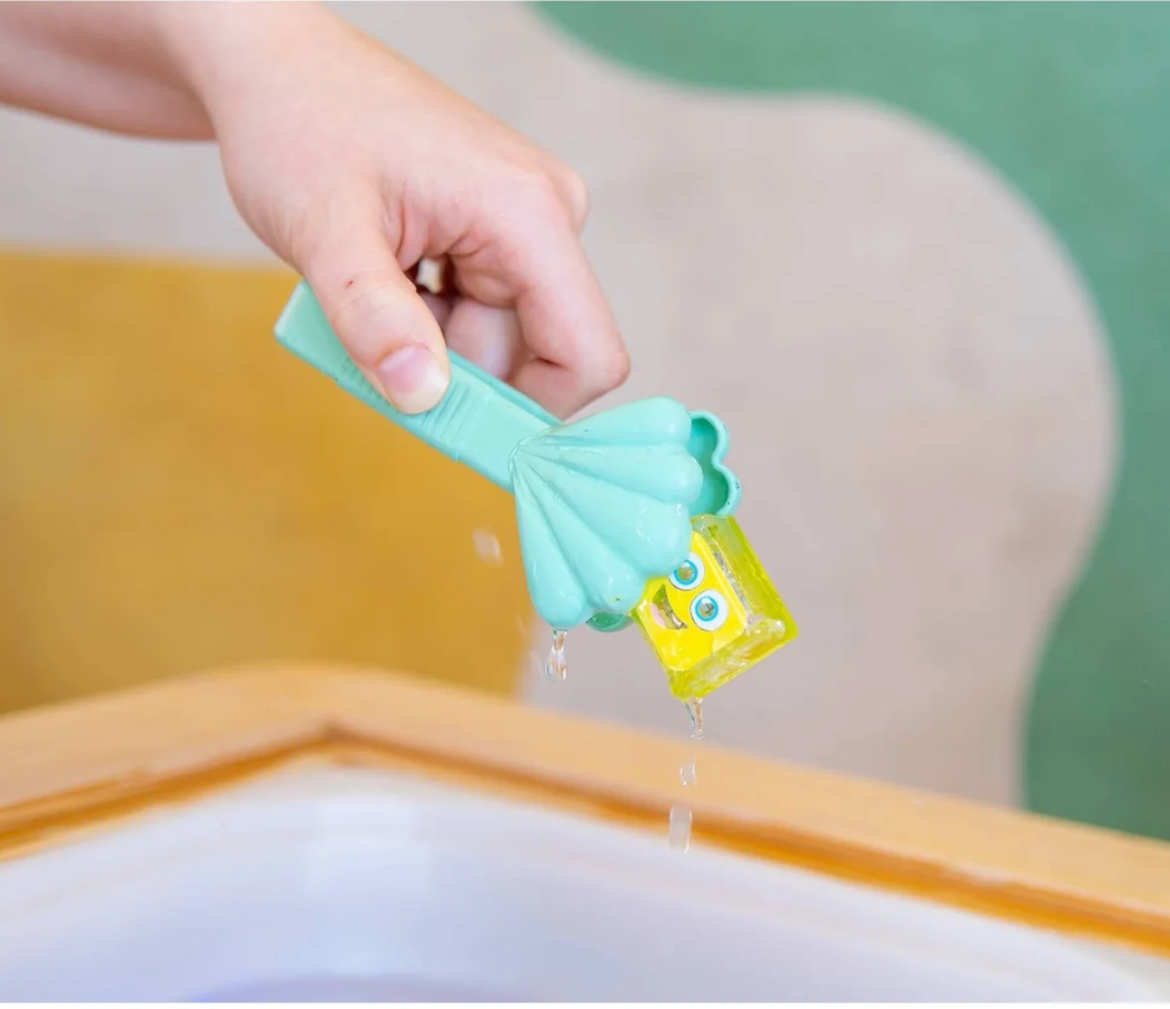 Included are 3 sensory tools: Puffer Pal Expandable Strainer, "Clamp" Shell Tiny Tongs, and a 3-in-1 Scooper Squid!