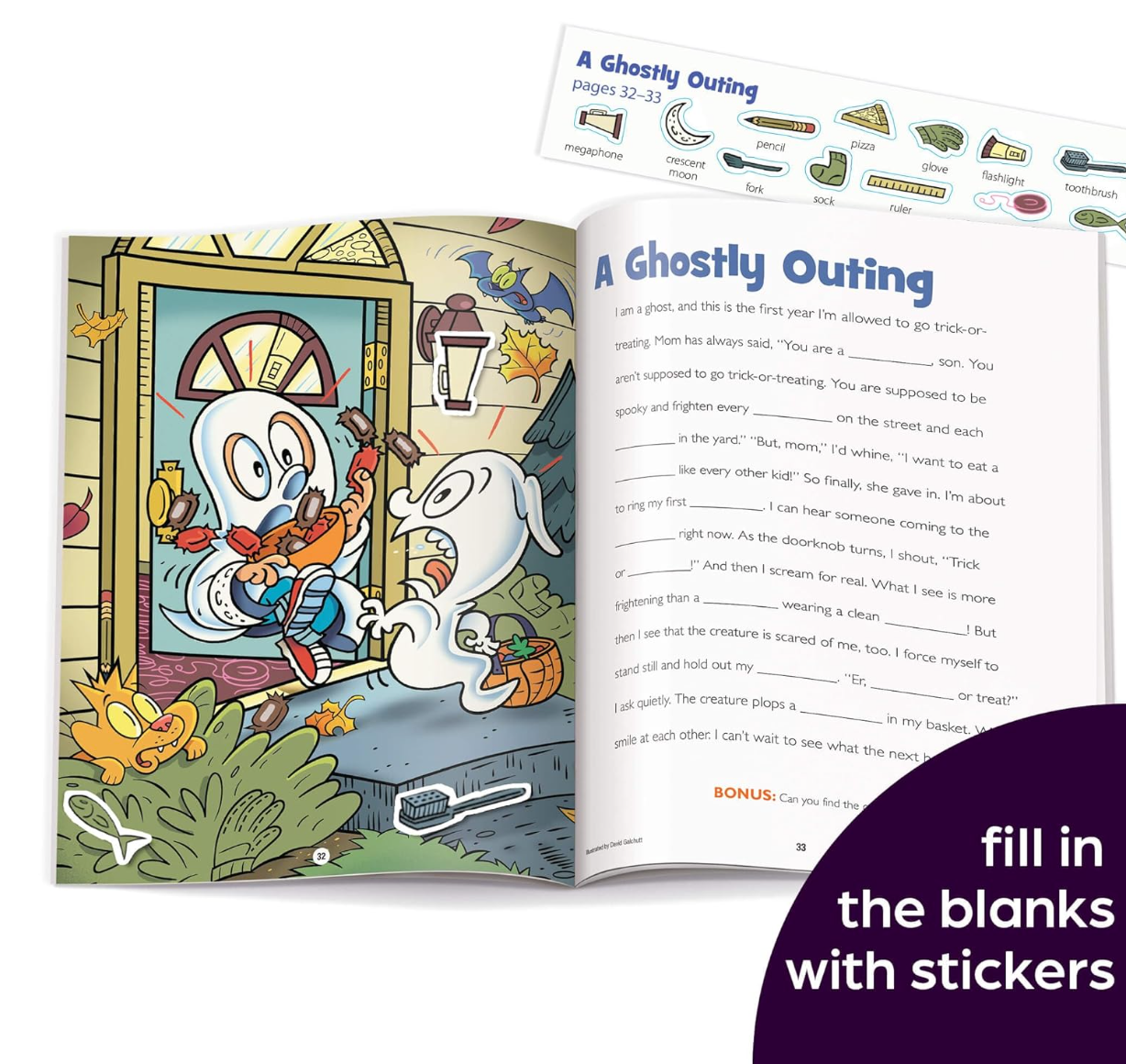 Halloween Tales is packed with spooky stories that get silly when readers get involved! Kids 6-9 will have a blast solving the Hidden Pictures puzzles, then placing the corresponding stickers in the blank spaces of the stories in whatever order they choose. They’ll create unique silly stories from a multitude of possible combinations.