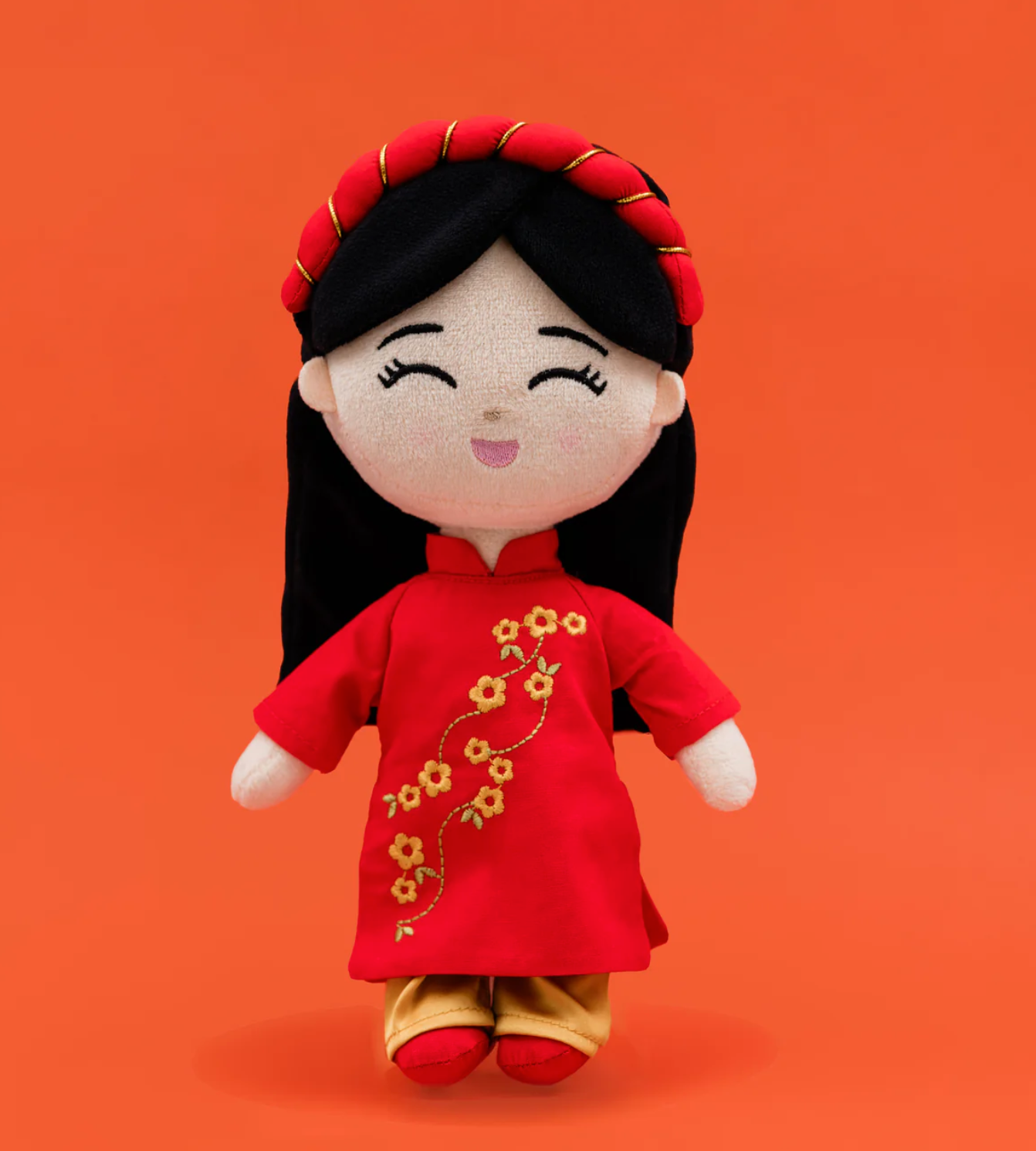 Meet Hoa – a vibrant 9” plush doll wearing a red áo dài with golden floral embroidery. Hoa honors Vietnamese traditions and Tet celebrations, making her a meaningful gift for kids discovering their culture or learning about others.