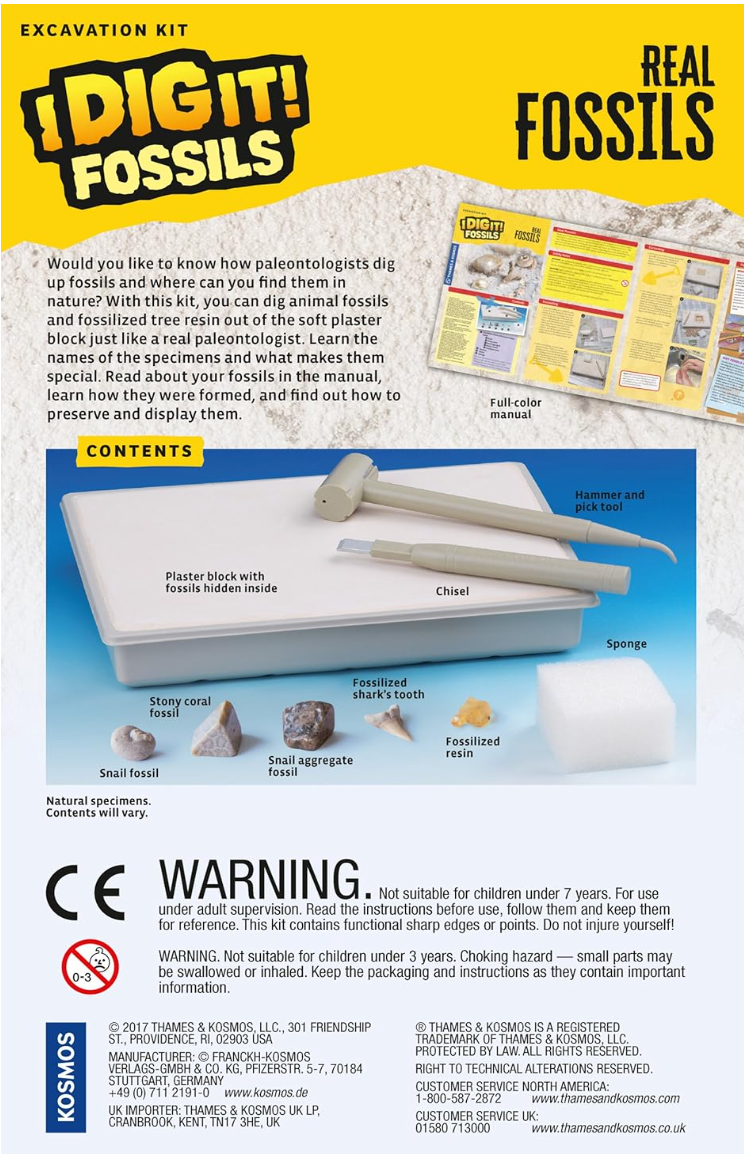 Learn how paleontologists dig up fossils and where can you find them in nature. Dig animal fossils and fossilized tree resin out of the plaster block. Learn about your fossils, including their names, what makes them special, how they were formed, and how to preserve and display them. The kit includes a snail fossil, stony coral fossil, snail aggregate fossil, and fossilized resin, and the tools to excavate them from the plaster block.