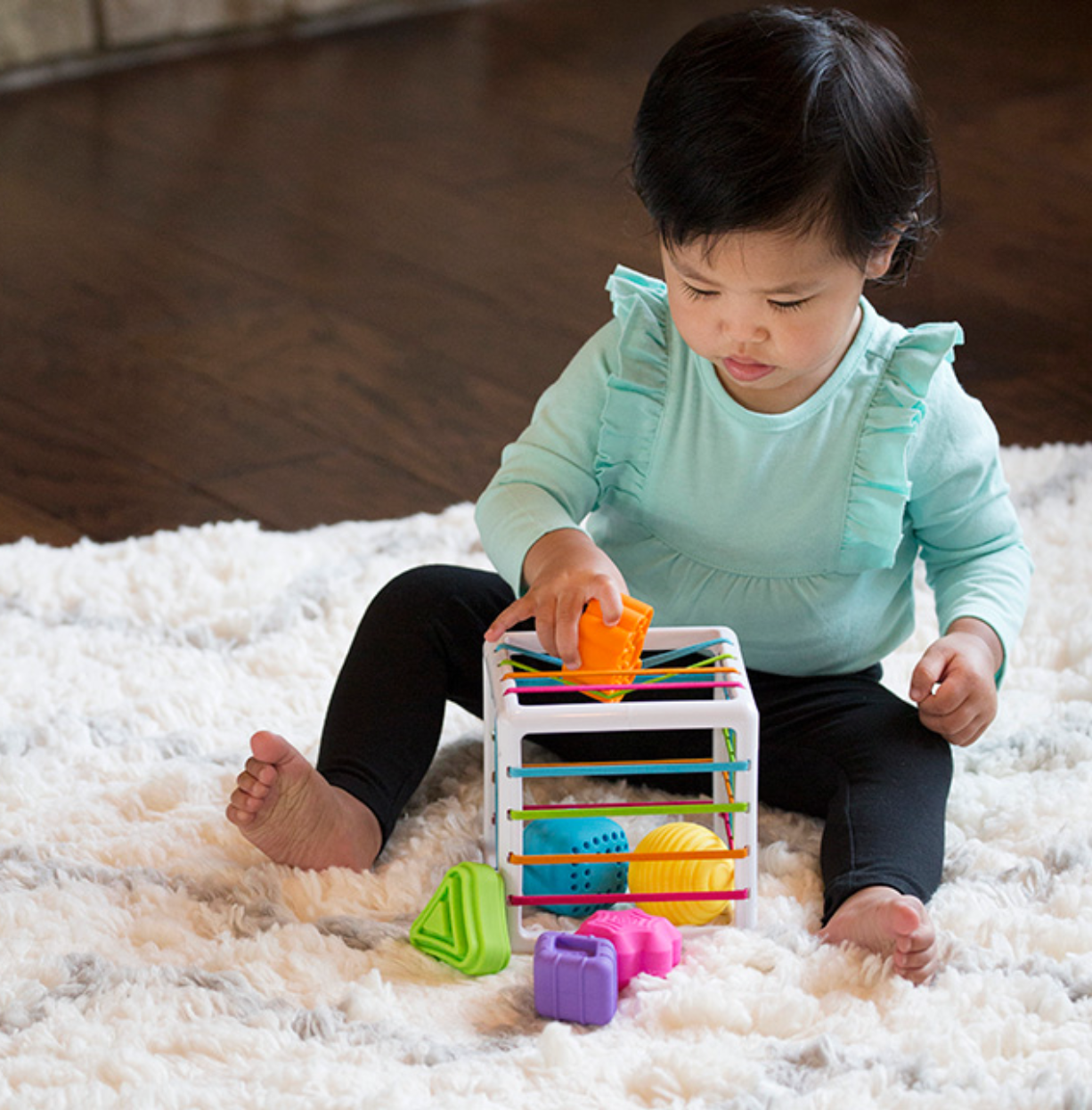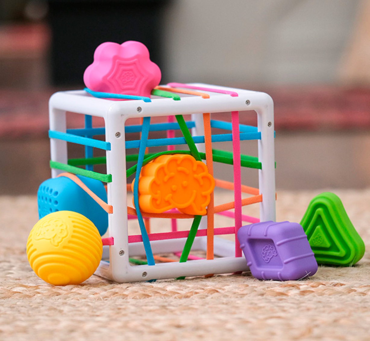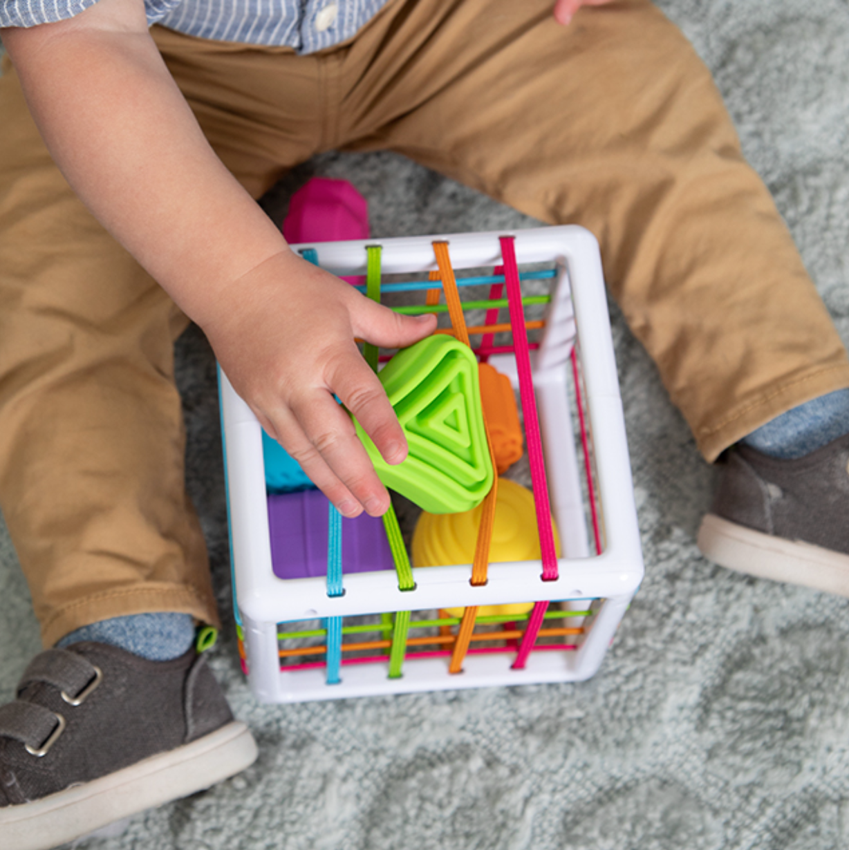 But the best part? As kids push the shapes through the elastic bands of the cube, curiosity is sparked and young minds can't help but explore, experiment, and discover.