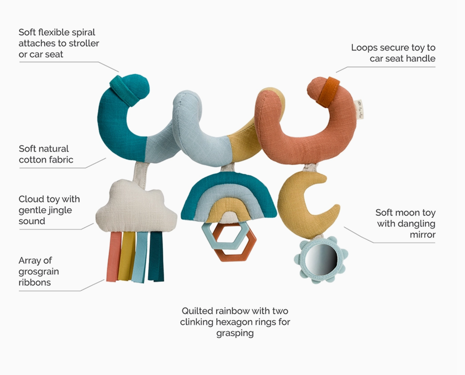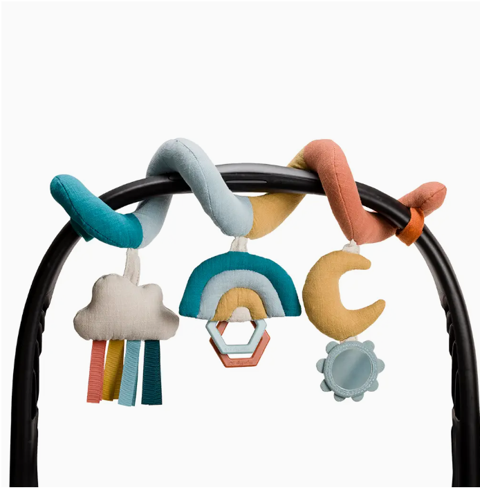Travel’s Abound! Endless adventures await with your babe’s new travel tagalong, the Itzy Bitzy Spiral™ from our Bitzy Bespoke™ collection! Watch as your babe reaches for the dangling rainbow rings, smiles at their reflection in the hanging mirror, and grasps for the ribbons keeping their little hands busy. Our natural cotton fabrics are gentle & soft to baby’s touch. For the many travels ahead, easily attach Itzy Bitzy Spiral™ to car seats and stroller for fun on-the-go!
