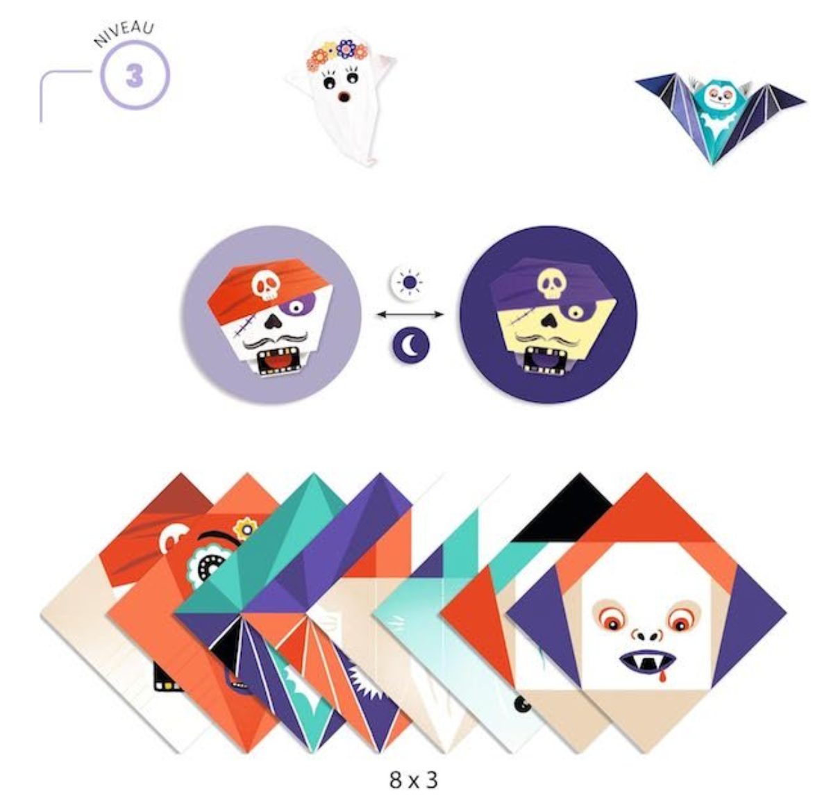 Thrills are guaranteed with this origami set whose characters, once folded, glow in the dark thanks to the fluorescent ink! Following the instructions in the booklet and the marked lines, children fold the sheets to make 24 characters from a haunted house.