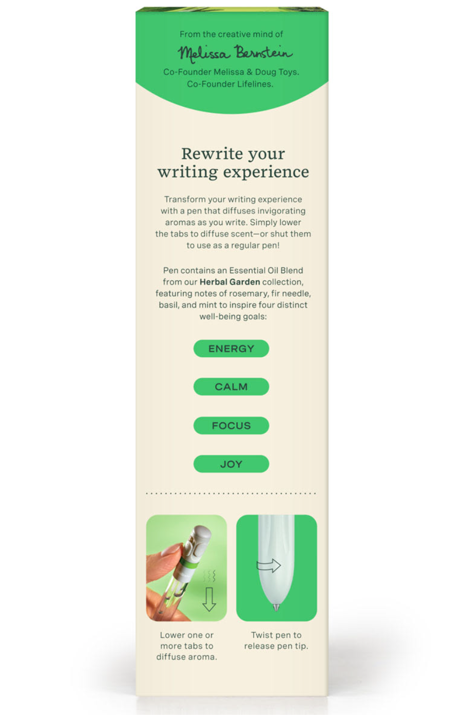 With this Pen Diffuser w/Essential Oil Blends – Herbal Garden from Lifelines, you will feel as though you are sitting in a calm garden as you work or study! Lower the tabs to diffuse notes of rosemary, fir needle, basil, and mint, and determine the potency by how many tabs you choose to lower. 1.00mm black ballpoint pen comes with 2 ink refills and diffuses an essential oil blend with natural fragrances to create the scent.