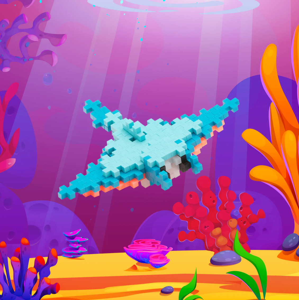 Soar through the sea with the newly designed Manta Ray! Now in a sustainable, plastic-free box! This sleek and graceful manta ray is packed with ocean-inspired creativity and fun. With 70 colorful pieces, you can build the manta ray then reuse the pieces to create your own underwater world.