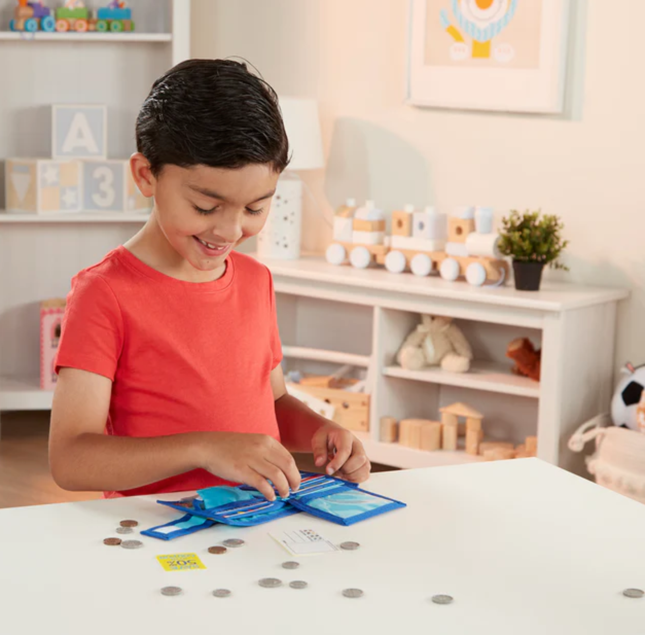 Make playful purchasing exciting with this 45-piece pretend play wallet, filled with everything kids need to run errands and go on make-believe shopping sprees! The folding nylon wallet with a self-stick tab closure has a long pocket to tuck away 14 play money bills, a see-through pouch for the 19 play coins, and handy slots for organizing 11 write-on cards, including bank cards, drivers license, library card, bus pass, and more! There are even “coupons” so young shoppers always get the best deals!