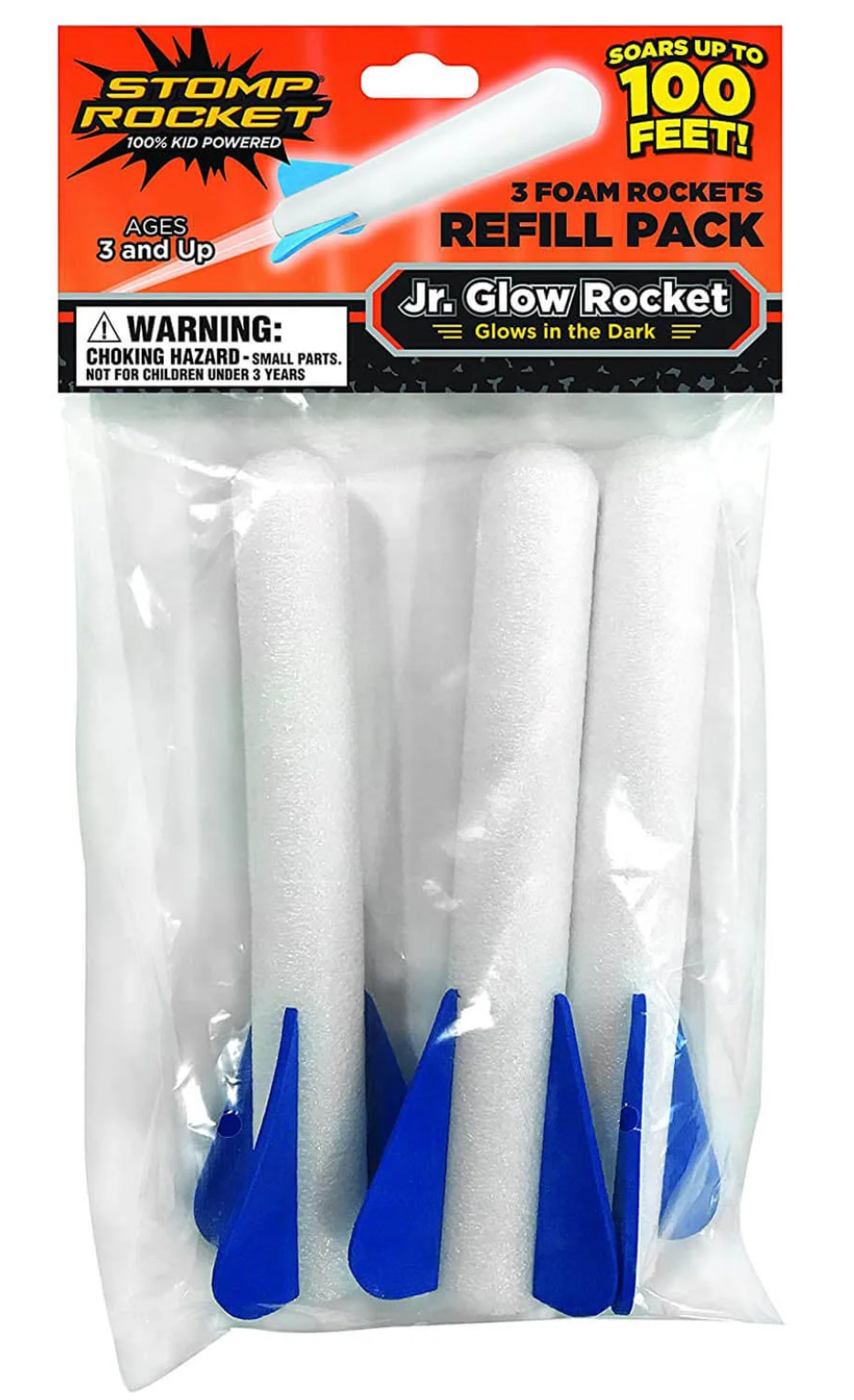 This Refill Pack contains 3 foam Jr. Glow Stomp Rockets — to launch these rockets, please use the Stomp Launcher that comes in The Original Stomp Rocket: Jr. Glow in the Dark 4-Rocket Set (20005). The Stomp Rocket Jr. Glow is 100% KID-powered! Run, jump and STOMP to launch these rockets up to 100 feet in the air! All-foam Jr. Glow Stomp Rockets are great for younger kids. They glow in the dark and are perfect for fun all day and after dusk! Stomp Rocket Jr. Glow is strong and durable, and great for active, outdoor play. Stomp Rockets have won lots of awards from industry experts, including iParenting Media, Dr. Toy and Creative Child Magazine. For kids ages 3 and up.
