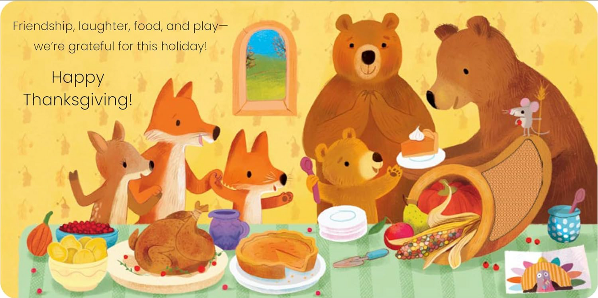 An adorable cast of forest friends gets ready for Thanksgiving as they spend time baking a pumpkin pie, making turkey decorations out of paper, playing football in the yard, and then finally gathering together for a wonderful feast. Each spread features a touch-and-feel texture for little hands to explore. This is a sweet and simple celebration of family, friends, food, and fun that will make the perfect Thanksgiving gift for toddlers.