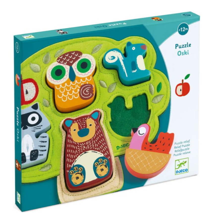 A wonderfully colourful 5 animal lift out wooden puzzle by Djeco. The animals are chunky and bright, and slot back into the fabric covered board with ease, making this a perfect puzzle for little hands.